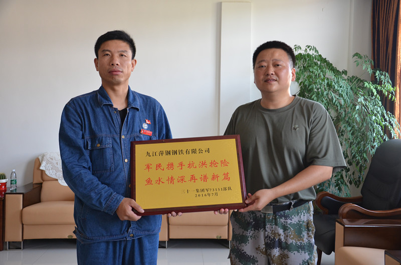 解放軍東部戰(zhàn)區(qū)31集團軍送牌匾感謝九江鋼鐵并肩抗洪(20160730)