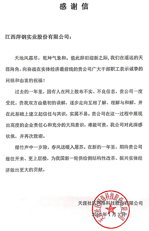 去年,有人蓄意在天涯社區(qū)網(wǎng)絡(luò)陸續(xù)發(fā)貼,捏造事實,詆毀方大萍鋼及相關(guān)領(lǐng)導(dǎo)。方大萍鋼立即拿起法律武器堅決捍衛(wèi)自己的權(quán)益。在此過程中,天涯社區(qū)作為一家在全球具有影響力的社區(qū)網(wǎng)絡(luò),對方大集團及方大萍鋼從最初的誤解,到逐步深入了解,最終被方大企業(yè)高度的責(zé)任心和充分的大局意識所感染和折服,雙方建立了信任與共識。在2017年新年之際,該公司專門致信方大萍鋼,表達欽佩和感謝,傳遞網(wǎng)絡(luò)經(jīng)濟與實體經(jīng)濟的互信和友誼。